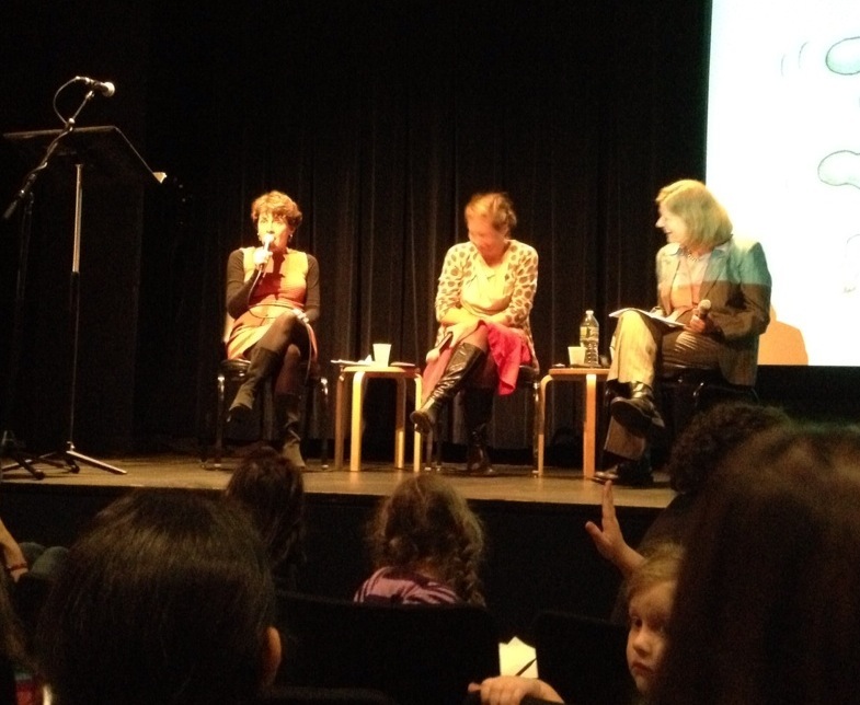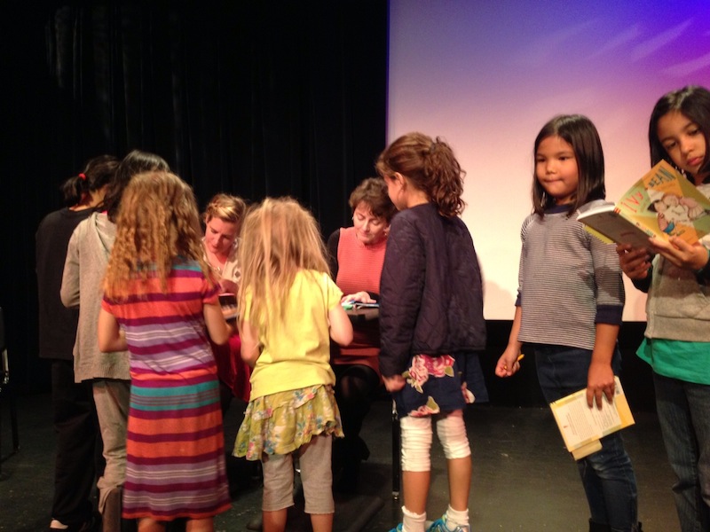 Well … as it turned out the night was a total hit. The series’ illustrator, Sophie Blackall, was there too and the pair were adorable: Barrows with short dark hair, darting eyes and a sly delivery; Blackall, looking very Park Slope boho, her blonde hair in a messy braid. Barrows read the first chapter from Make the Rules and, even though she was losing her voice, made it sound fresher and funnier than I remembered. They showed a slideshow with pictures of their own kids, their desks, early sketches of the characters, and alternate book covers. For S, it was a great introduction into the process of putting together a book. There was even a little writing exercise for the kids. Barrows read a graph of what sounded like the beginning of a new Ivy & Bean escapade and then told the girls to continue the story with the paper and pencils handed out earlier.