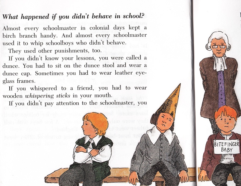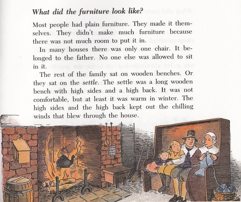 It was a picture of the colonialists sitting in church on Sunday. According to the book, there was someone called a tithing man who walked around the meetinghouse with a long wooden pole with a wooden knob at one end. If you fell asleep during church, he knocked you on the head. I remember loving a double-page illustration of the moment he was about to rap some poor, snoring colonialist on the noggin. For some reason, it’s not in the new edition. Tis a shame.